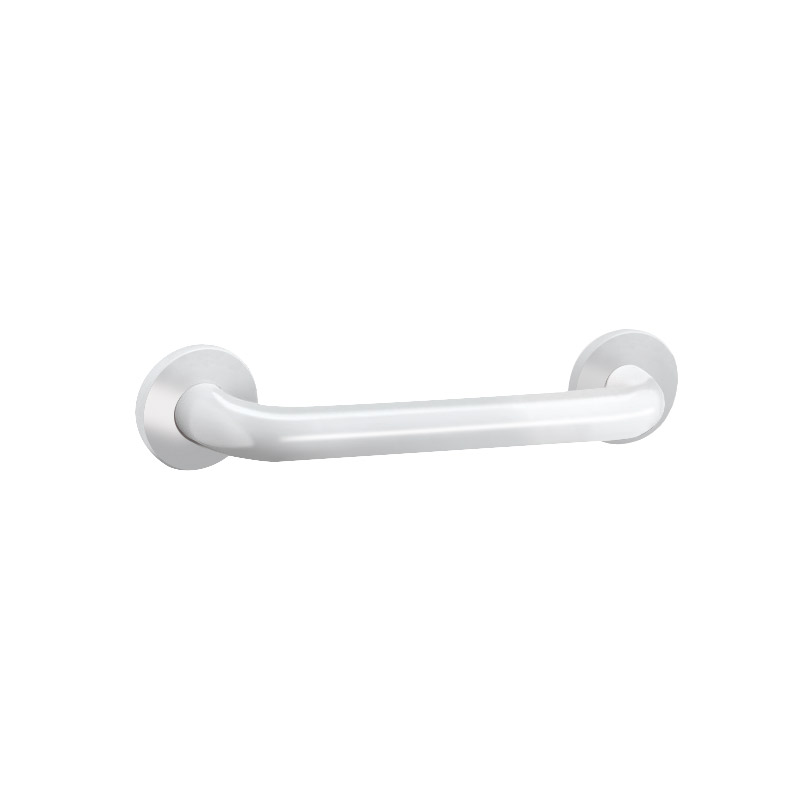 Grab bar made from white powder-coated stainless steel.