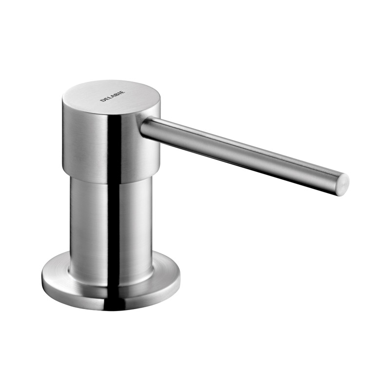 Deck-mounted liquid soap dispenser with 30-year warranty.