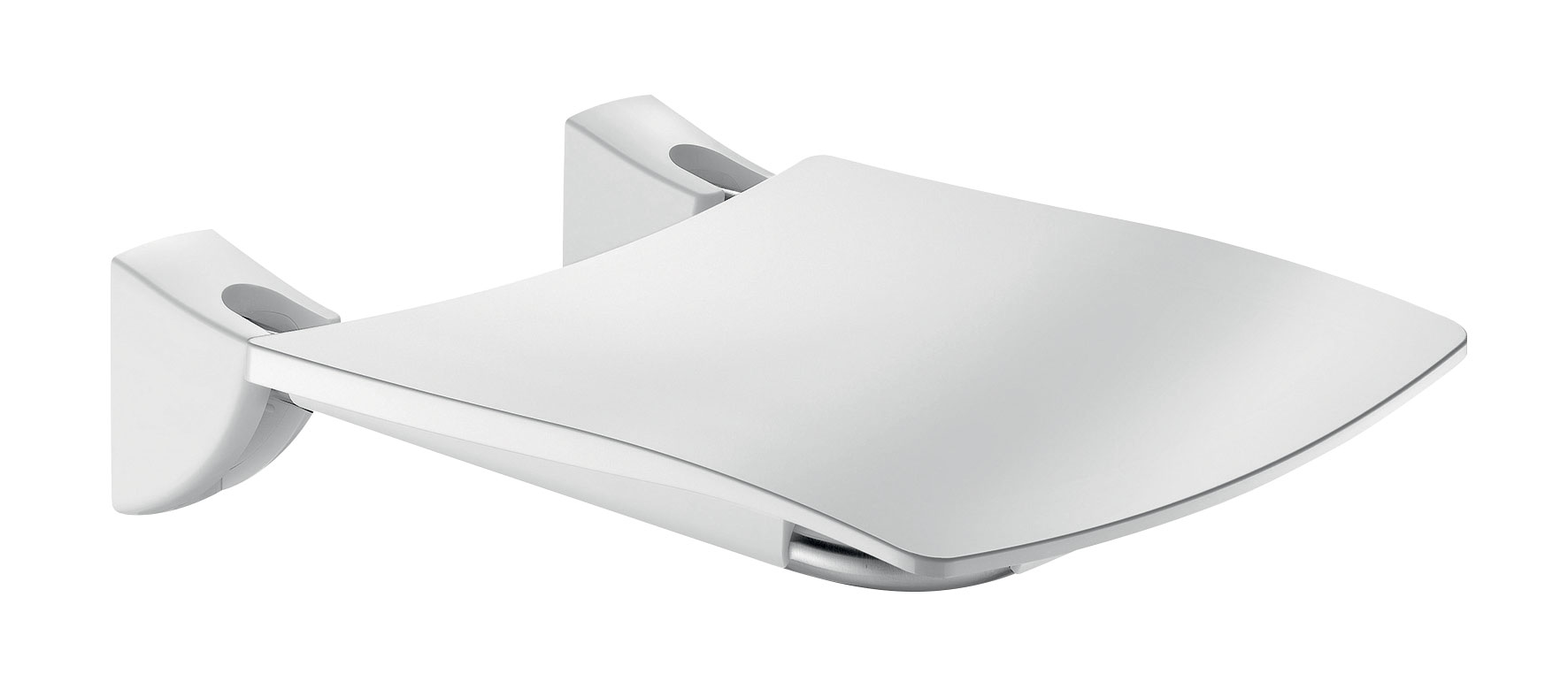 Wall-mounted, lift-up shower seat for fixed installation.
