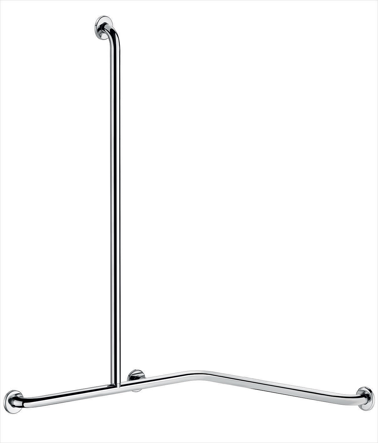 Angled shower grab bar with vertical bar, bright stainless steel
