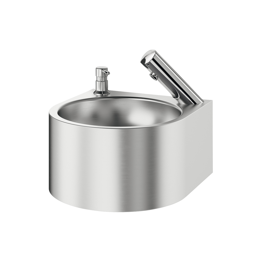 Supplied with WRAS approved electronic tap with integrated batteries and solenoid valve, a WRAS approved thermostatic mixing valve and a chrome-plated brass soap or hyrdroalcoholic gel dispenser.