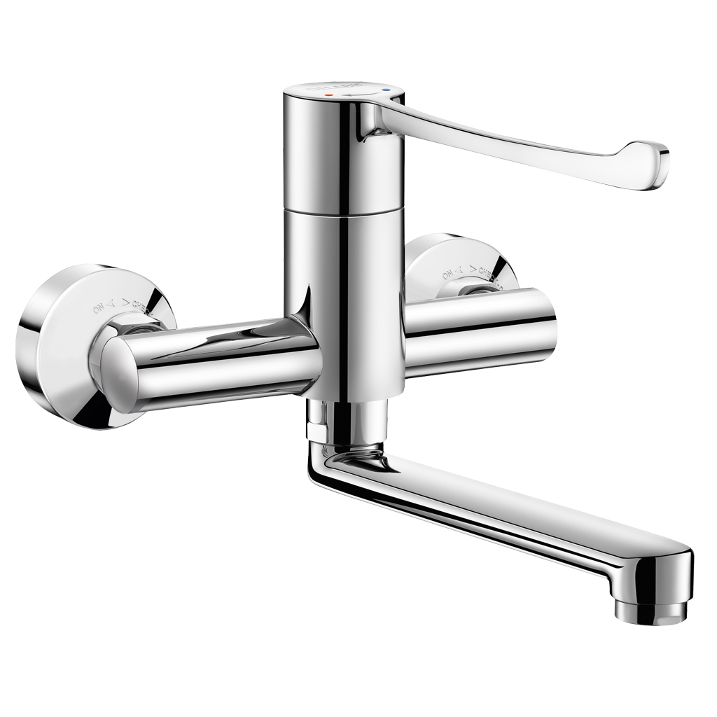 Ref. 2437Wall-mounted sequential mechanical basin mixer.