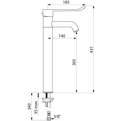 Single hole, single control mixer with fixed spout H. 305mm L. 140mm.